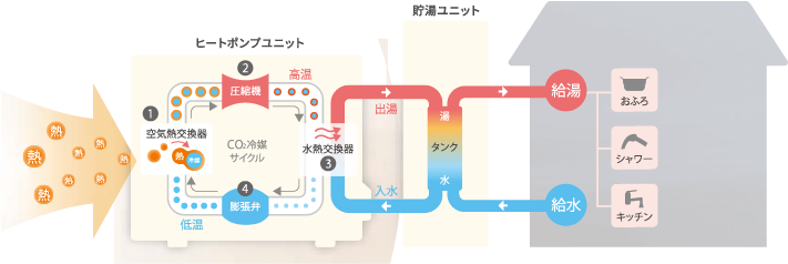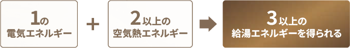 ヒートポンプ方式では、電気と空気熱を併用。「1」の電気エネルギーを使って「2以上」の空気熱エネルギーを集めるので、効率的にお湯が沸かせます。