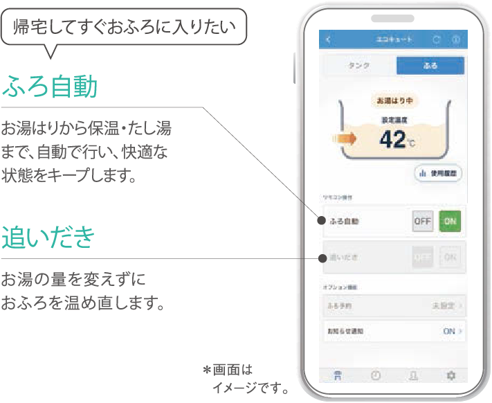 帰宅時間に合わせてふろ自動をONにすれば、ムダなく快適な温度・湯量にしてくれます。
